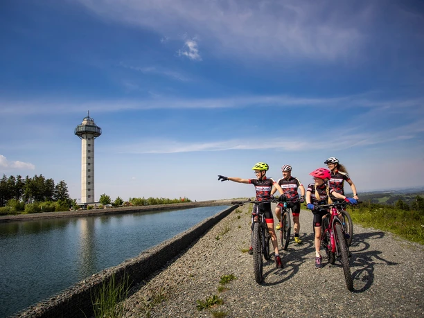 Unsere schwarze Hasen Tour geht nun weiter auf der roten Hasen TourWir folgen dem roten Hasen flach bergauf. Vorbei an einer Schutzhütte „Zur schönen Aussicht“ mit einem tollen Panorama über das Sauerland und in die tiefgeschnittenen Täler. Ohne große Anstrengung kommen wir zur Graf Stollberg Hütte, die mit ihrem spektakulären Ausblick ins Sauerland zur Einkehr einlädt. Hinter der Hütte geht es über einen naturbelassenen Weg zur Diemelquelle. Ein bisschen mit dem Wasser „pämpeln“, wie der Willinger sagt, und unsere Tour geht weiter.